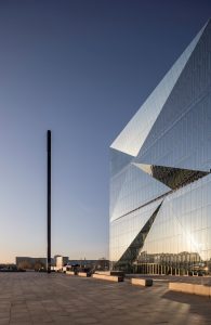 Due to the combination of glass used in the fully glazed façade, the aesthetics are visually appealing, reflecting the building’s surroundings on all sides and dynamically changing its appearance depending on the viewing angle, the weather and time of day. The dynamic façade uses a stepped thermal façade beneath an outer glass skin, which wraps the building in a triangular pattern. Access points are introduced through a set of articulated openings in the outer skin on all four sides and on multiple floors.