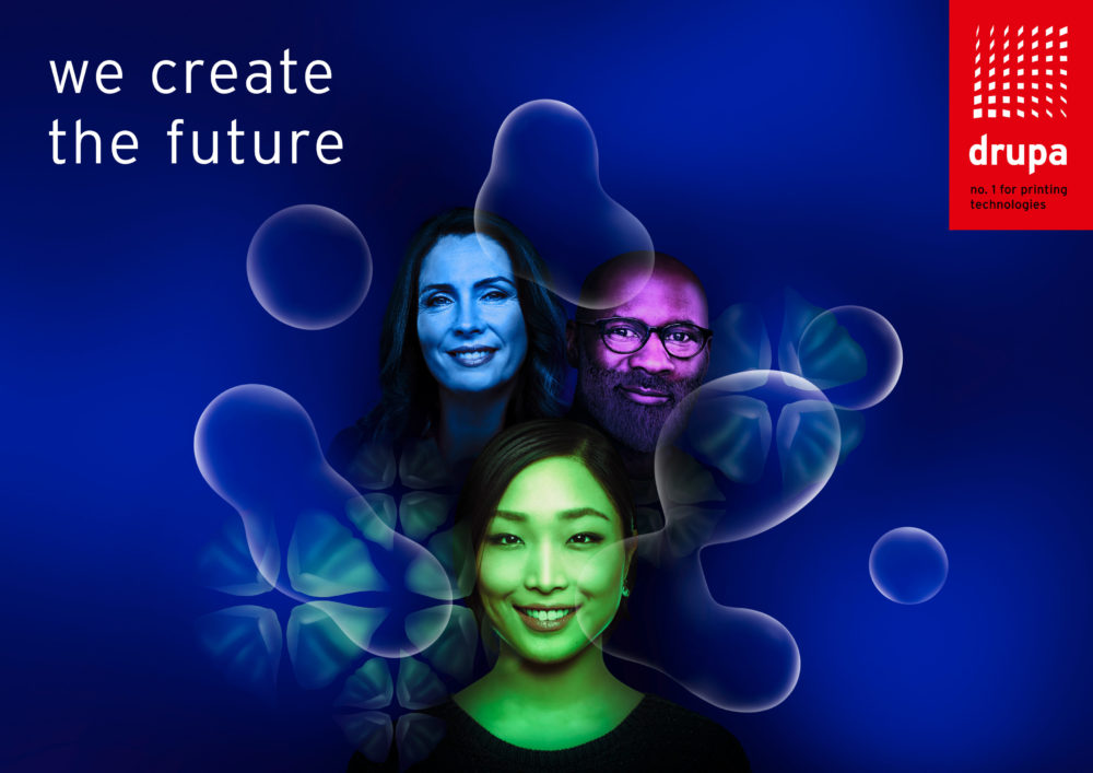 International faces represent the target group of drupa which is looking forward to networking in a fascinating atmosphere characterized by diversity. Organic structures stand for aesthetics, design, and the beauty of nature. The new claim ‘we create the future’ underscores the clear commitment of the community to jointly and proactively participate in the continuous development and design of the sector. And it represents thought leaders as well as high-quality knowledge transfer.”
