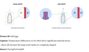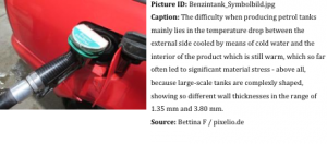 “Cooling of the plastic product represents both one of the most critical and most lengthy sub-processes in the extrusion blow moulding process,” explains Aaron Farrag, deputy CEO of the FarragTech GmbH. “Especially during production of multi-layer products such as modern fuel tanks, a lot of time can be saved and the EVOH-layer protected against damages due to heat exposure.” During the process, difficulties can occur due to the temperature drop between the exterior cooled by means of cold water and the still warm interior of the product. These temperature differences so far often led to significant material stress – above all, because the large-scale tanks are complexly shaped, showing so different wall thicknesses in the range of 1.35 mm and 3.80 mm. Until recently, this was counteracted by means of interval blowing. But this process was less effective. As a rule, the results were unsteady product quality as well as failure to pass the subsequently carried out tightness tests, load tests as well as drop tests. By reason of the relatively high scrap rate, the costs of production increased.