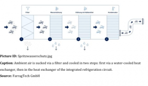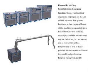 Simple (ambient) air dryers are employed for the use of MAP systems. The system functions in that the mould area of the machine is separated from the ambient air and supplied directly by the MAP with filtered, dry air. In this way, a continuous use of cold water up to a temperature of 6 °C is made possible without condensation on the mould surface forming. Ambient air is sucked via a filter and cooled in two steps: first via a water-cooled heat exchanger, then in the heat exchanger of the integrated refrigeration circuit. In this, the air is cooled to approximately 3 °C. For pre-cooling of the sucked ambient air during the process, cold water is used which also serves to cool the moulds. The humidity, which is eliminated as a result of condensation, gathers in a trough and is conveyed out of the device using a pump. Thanks to the isolated machine environment, a trouble-free daily work routine is now possible also in the summer with a higher air humidity : Often the cold water had to be heated again in order to ensure trouble-free production. As a result, the production process took more time.
