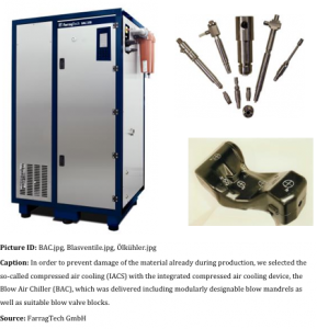 Foam-insulated cold air pipes ensure that the air temperature on the way from the BAC device to the blow tools can be kept low and does not freeze or the condensation water does not drop into the production hall. Control of the BAC devices takes place via the specially developed Farrag Intelligent Terminal (FIT). In this way by means of the IACS system, material stress could be efficiently prevented and a higher quality of the produced plastic parts could be achieved in total.
