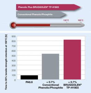 Phenolic Plus extends the heat stabilization of polyamides to peak temperatures of 180°C, something not possible for hindered phenolic antioxidants and organic phosphites. Furthermore, due to the high efficiency of Phenolic Plus, lower dosages are possible than those needed by conventional phenolic/phosphite blends in order to achieve the same effect. For example, in trials at 150°C, the dosage of Phenolic Plus BRUGGOLEN TP-H1803 could be reduced by 30% compared to that of a standard stabilizer package, whilst still maintaining the same level of tensile strength retention after heat aging.