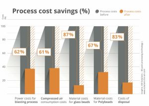 The introduction of the S1 blasting systems led to annual cost savings of approximately € 35,000 by reducing blasting media consumption, disposal efforts, power requirements, and compressed air consumption.
