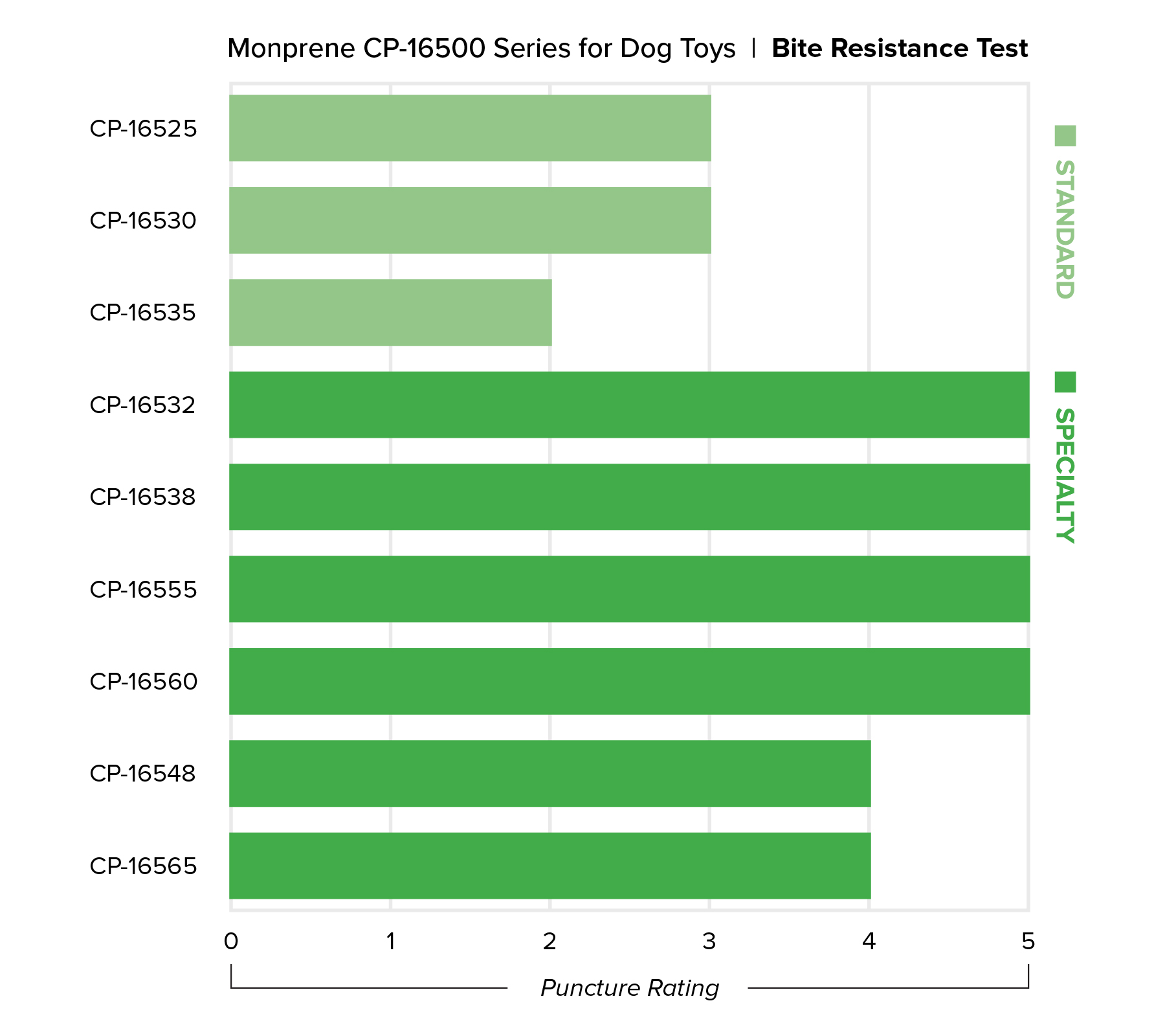 The latest series is now specifically designed for use in the manufacture of pet products. Monprene CP-16500 series of thermoplastic elastomers (TPEs) are durable and sustainable alternatives to thermoset rubber for dog toys, with a broad range of performance and aesthetic characteristics. This series includes clear, translucent and opaque grades with low, medium and high gloss. All grades exhibit excellent colorability and are easily moldable. This extensive portfolio includes specialty grades that offer improved durability with superior resistance to puncture and tear—ideal for the demanding applications of dog chew toys. In order to help compare the durability of different materials, Teknor Apex designed a “bite resistance” laboratory test to simulate the forceful action of a dog biting a toy. Based on the ASTM test method F1306 for flexible films, the Teknor Apex Bite Resistance test measures the puncture resistance or the force required to penetrate an injection molded specimen. A “Puncture Rating” is assigned to each material based on this force, and uses a scale of 1 to 5, with 5 having the greatest resistance.