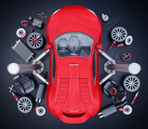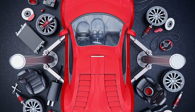 top view of supercar lifted on elevator and car parts around.3d render.This is in 100% my own project.Property Release is not required.